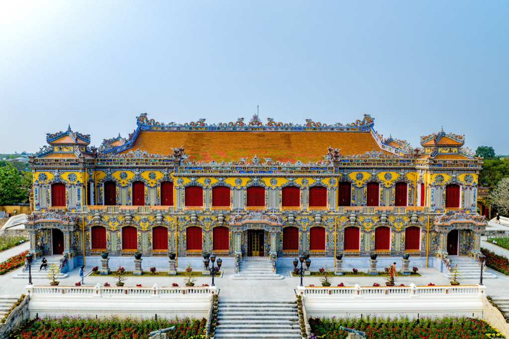 第一景點是順化皇城:一抵達順化皇城,你就可以看到大門外隨風飄揚的國旗,再回頭看看身後的皇城,既端莊又絢麗。順化皇城就是仿北京紫禁城而建的,所以在參觀這座阮朝故宮時,難免會讓人覺得有中國的影子。越戰時期,順化也曾是美軍和越共的戰場,因此不少建築遭受破壞,在歷經多年的修護、重建後,皇城仍有相當多可供參觀的建築。