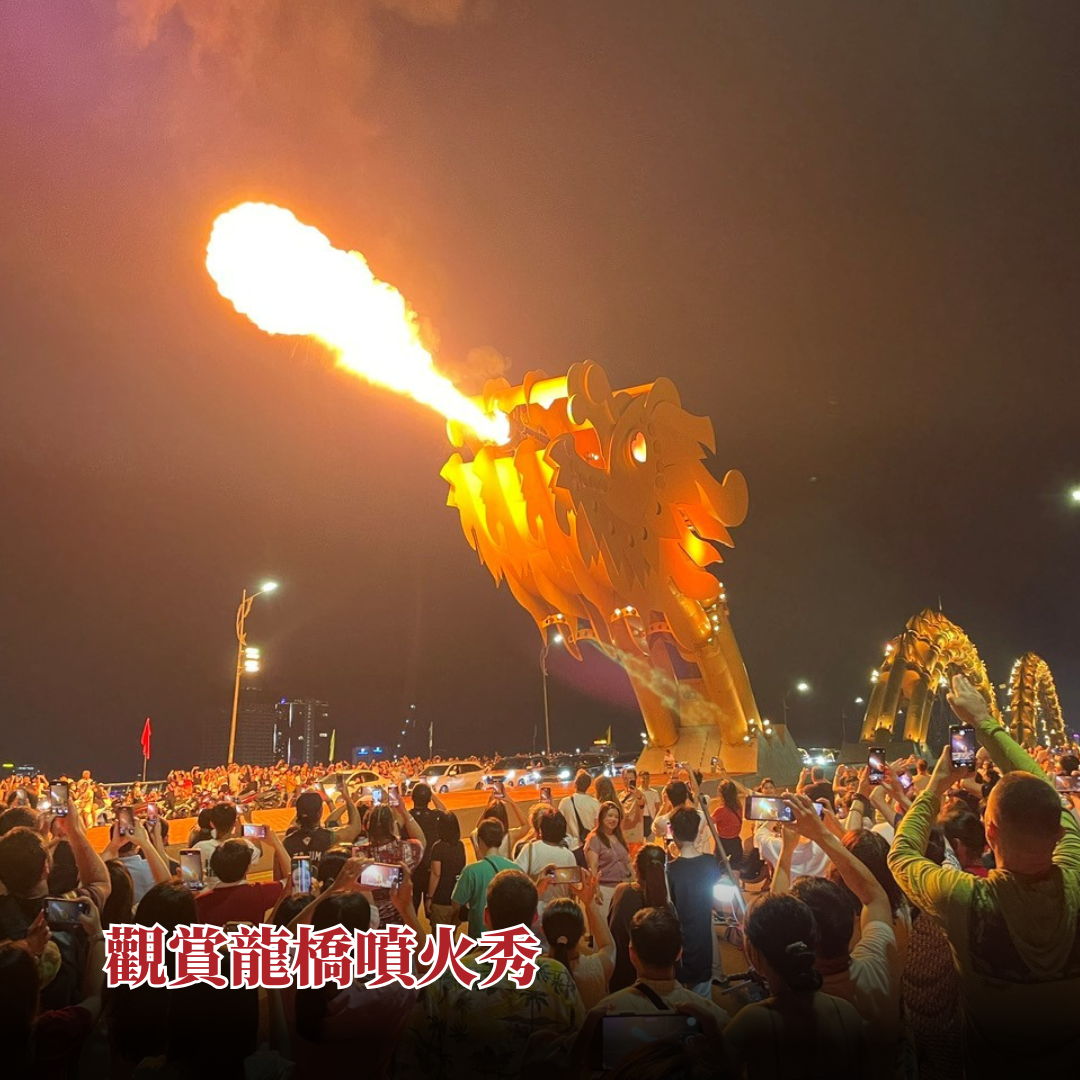 約16:30搭乘纜車下山,返回市區。傍晚前往峴港龍橋,這座橫跨韓江的地標性橋樑,以龍形設計聞名,週末可欣賞噴火噴水表演。