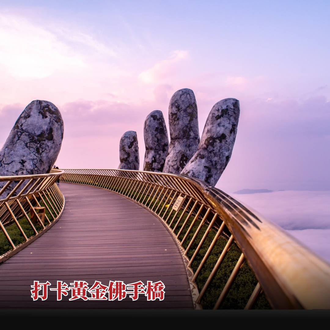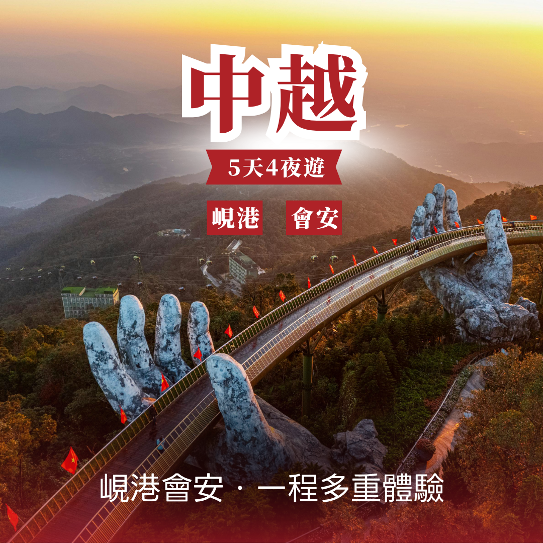 5天4夜的峴港-會安之旅,融合了度假放鬆、自然景觀與在地文化體驗,帶您深入感受越南中部的獨特魅力。您將登上巴拿山,漫步於雲端之上的佛手橋,穿梭於法國村歐式建築之間,感受山頂清新涼爽的氣候與壯麗景致。接著探索五行山、靈應寺與美溪海灘,體驗山海交織的自然風光與當地生活氛圍。行程亮點延伸至會安,您將體驗椰林竹籃船、走訪茶桂蔬菜村,親手製作越南料理,並在夜晚漫步於燈籠點亮的古鎮街道,沉浸於浪漫而溫暖的氛圍之中。旅程最後安排輕鬆的自由活動時光,讓您在離開前再次感受這片土地的寧靜與美好,為整趟旅程留下難忘回憶。