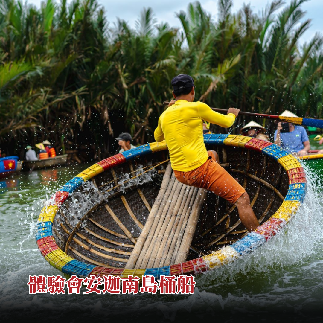 上午約09:00出發前往會安。首先抵達椰子林生態區,體驗獨特竹籃船,欣賞當地漁夫撒網表演,並可參與釣小螃蟹及刺激的旋轉船體驗,過程趣味十足。