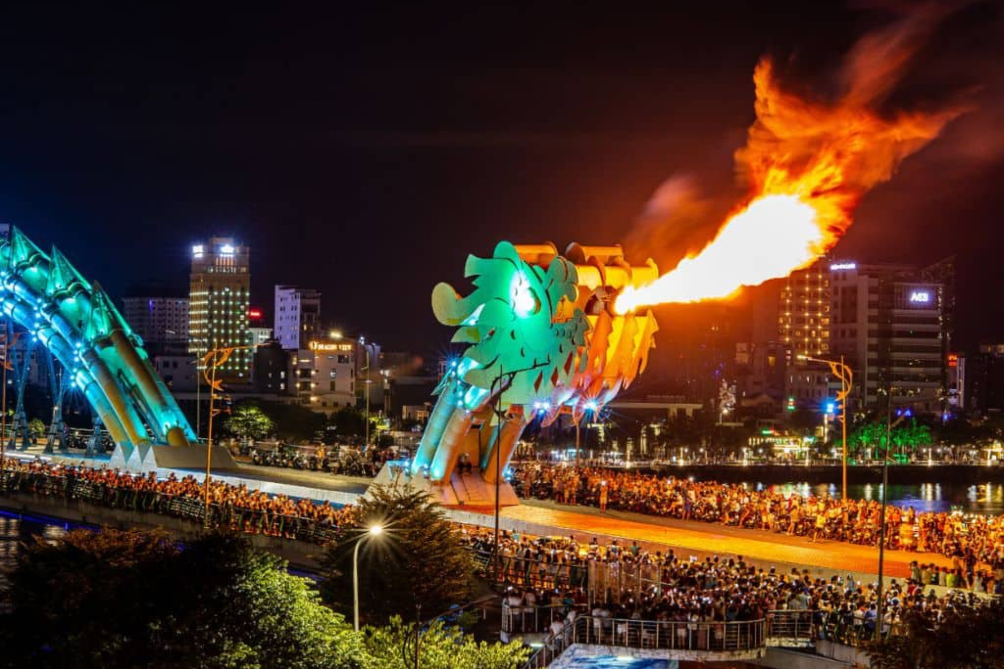 峴港龍橋是一座跨越韓江的拱橋,以其獨特的龍形設計和夜間的噴火、噴水表演而聞名,是峴港的著名地標之一。 龍橋全長666米,寬37.5米,擁有六條車道,於2013年正式通車。 每逢週末和特殊節日,龍頭會噴出火焰和水霧,吸引眾多遊客觀看。