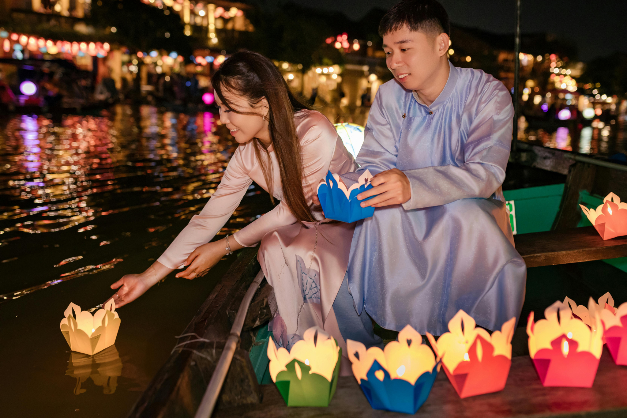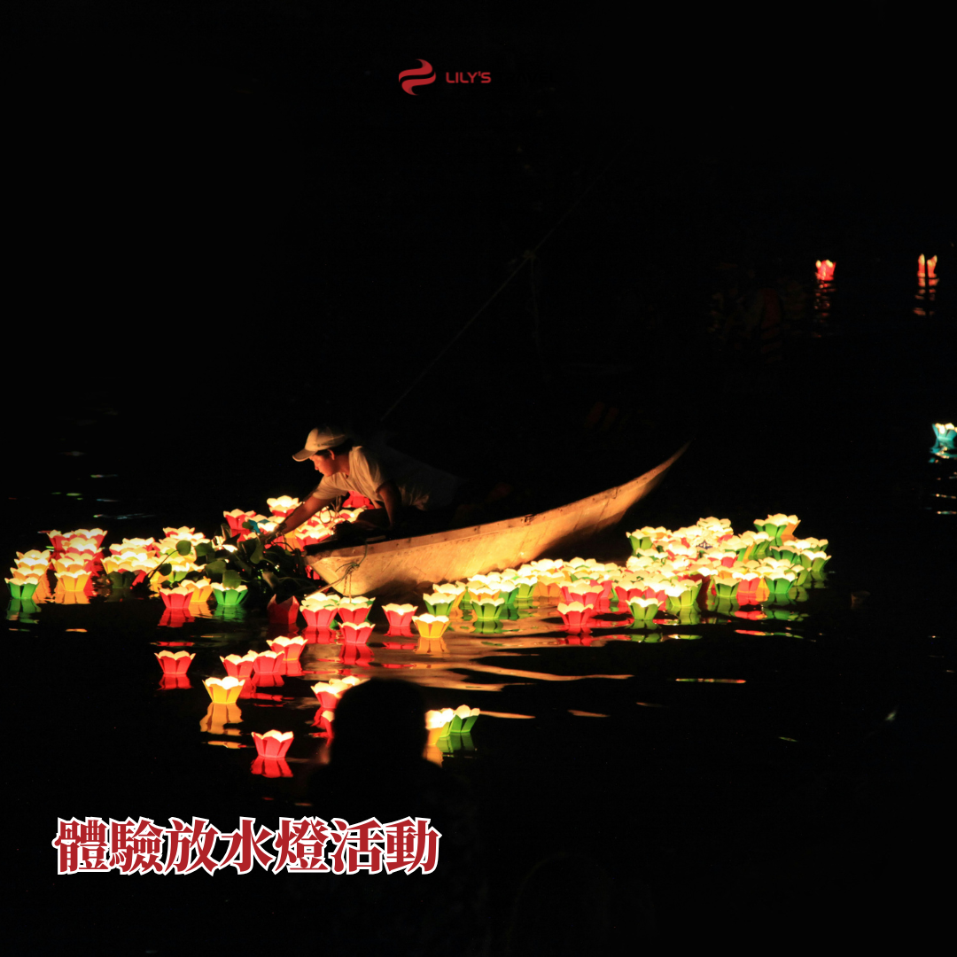 您将体验放天灯,这是一种会安当地特有的文化特色。您将有机会欣赏到河畔浪漫宁静的美景,并在夜空下感受到放松和舒适的氛围。
