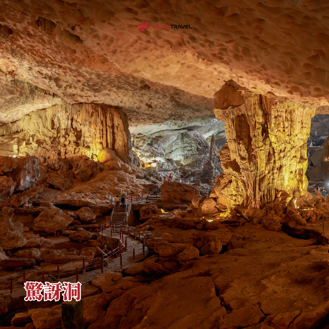 07:30–08:30 探索驚訝洞。這是下龍灣最大、最美麗的洞穴之一。 洞穴有一些獨特的岩層,在其他地方都找不到。通往驚訝洞口的小路在一片樹葉的樹冠下。走在陡峭的石階上,遊客有如登高望的感覺,體驗如踏上天空的刺激。