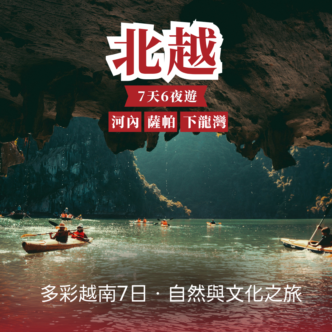 從河內出發,搭乘夜車前往薩帕,探索貓貓村、體驗彩虹滑道,並登上番西邦山感受壯麗高山景觀。走進Lao Chai與Ta Van村,深入少數民族生活。返回河內後前往寧平,參觀華閭古都、乘船遊覽長安並登臥龍山俯瞰山水全景。接續前往下龍灣,搭乘郵輪探索Luon洞、划獨木舟與登英雄島,並參觀壯觀的驚訝洞。一次串聯山岳、文化與海灣的北越經典路線。